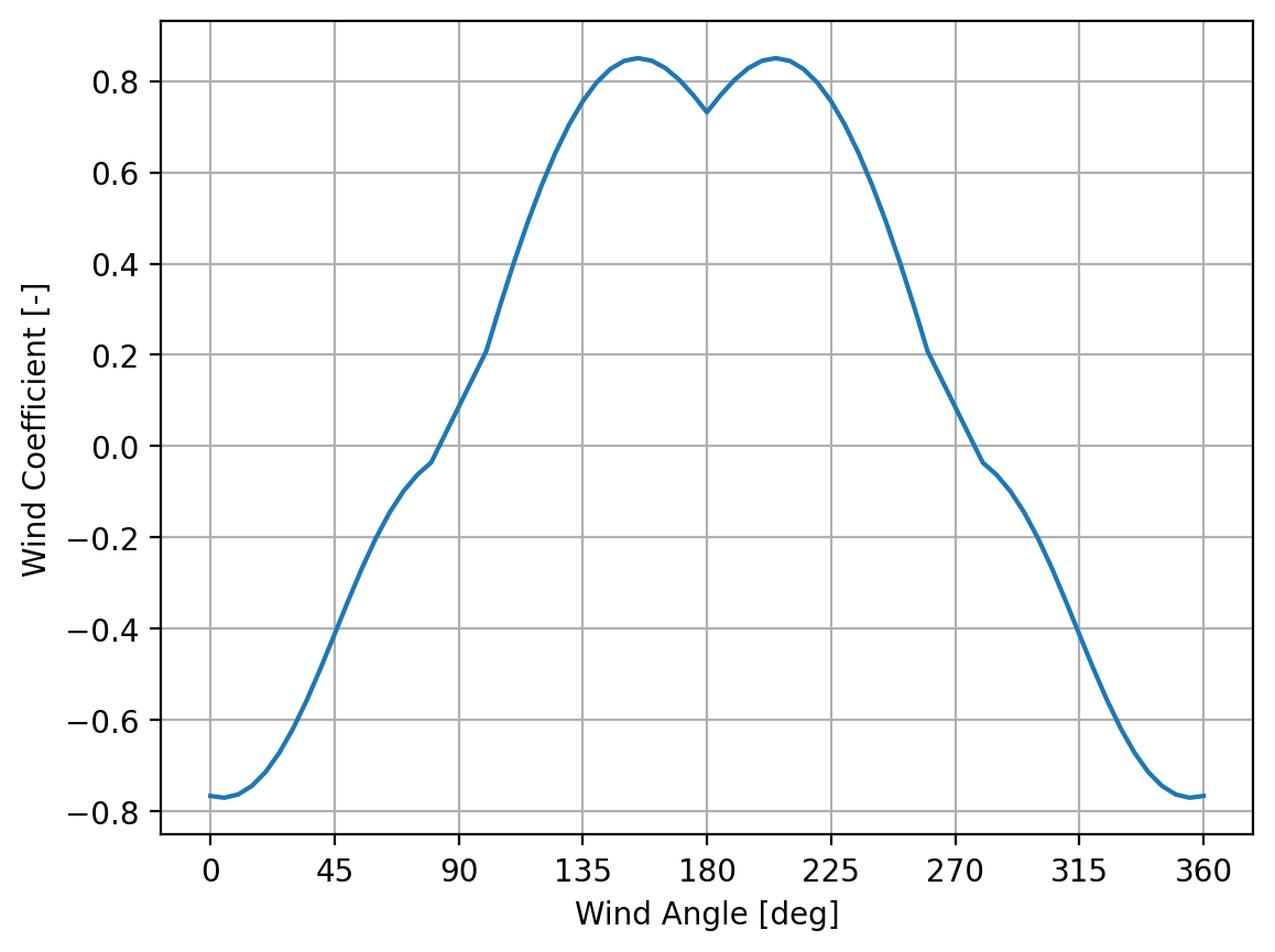 import matplotlib.pyplot as pltwind_dir = np.arange(0, 361, 5)cx = [fujiwara(aod =905, axv =1750, alv =7400, cmc =-6.6, hc =11.72, hbr =40.7, loa =340, b =62, wind_dir = i, smoothing =10) for i in wind_dir]plt.plot(wind_dir, cx)plt.xlabel('Wind Angle [deg]')plt.ylabel('Wind Coefficient [-]')plt.xticks(np.arange(0,361,45))plt.grid()